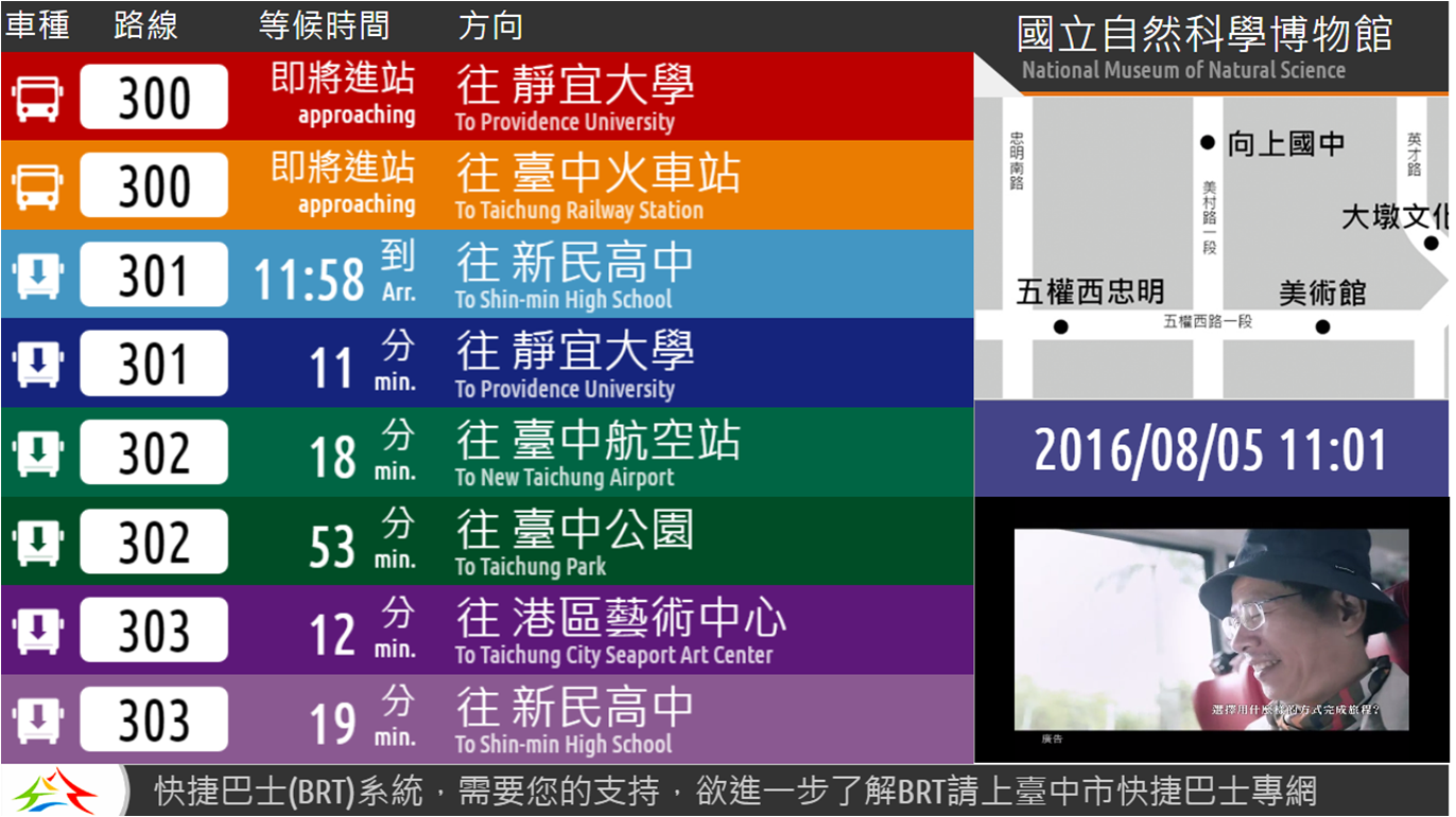 - 左側為8條公車路線的動態資訊,翻頁輪播方式顯示路線公車到站資訊,公車到站資訊有中英文顯示。